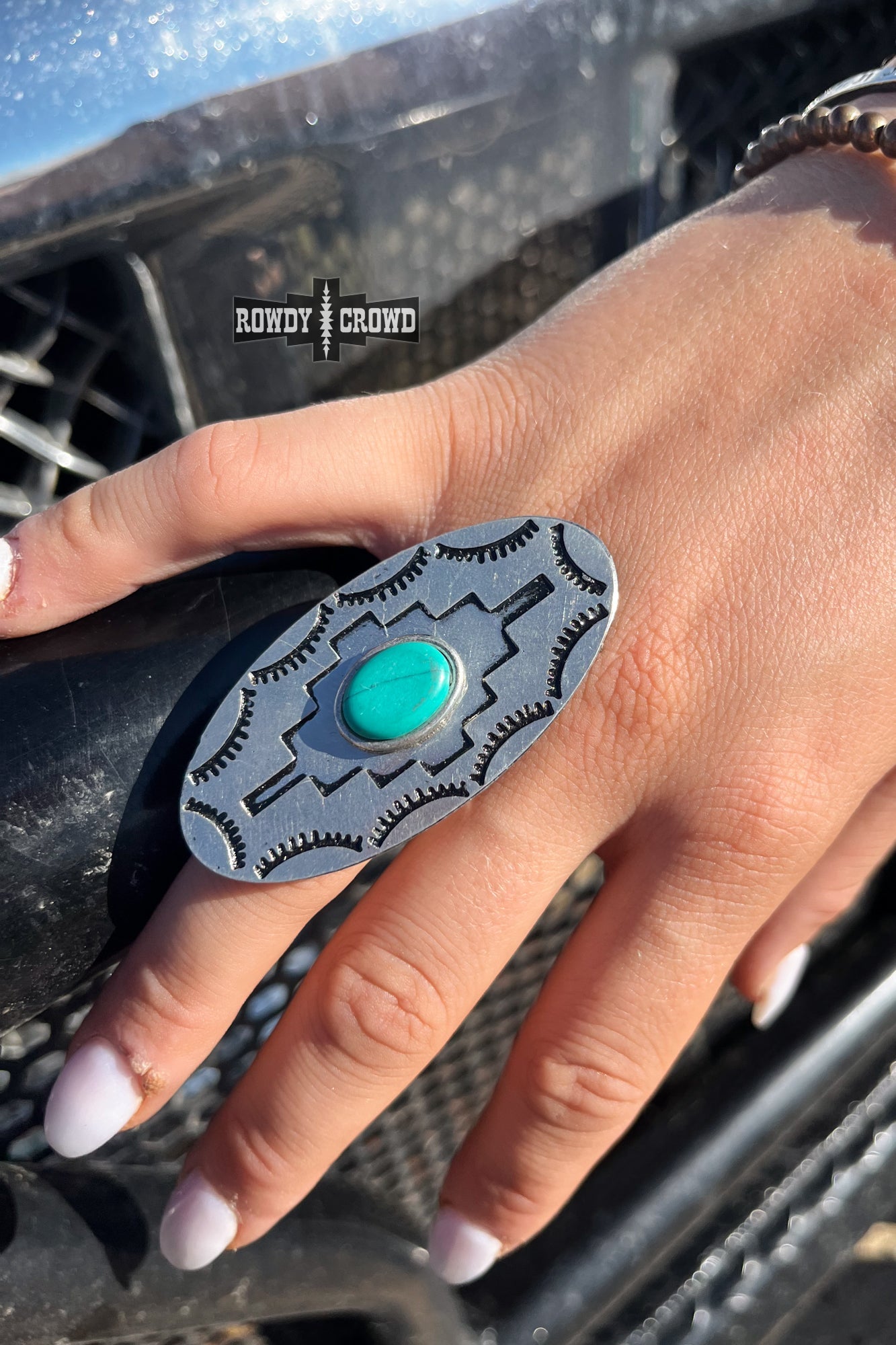 The Tough Luck Scarf Slide features a vibrant turquoise bead, surrounded by intricate Aztec-inspired stamping. Detailed silverwork along the edges adds texture and tradition, making it a bold, culturally rich accent for any Western look. You won't be S.O.L with this slide.